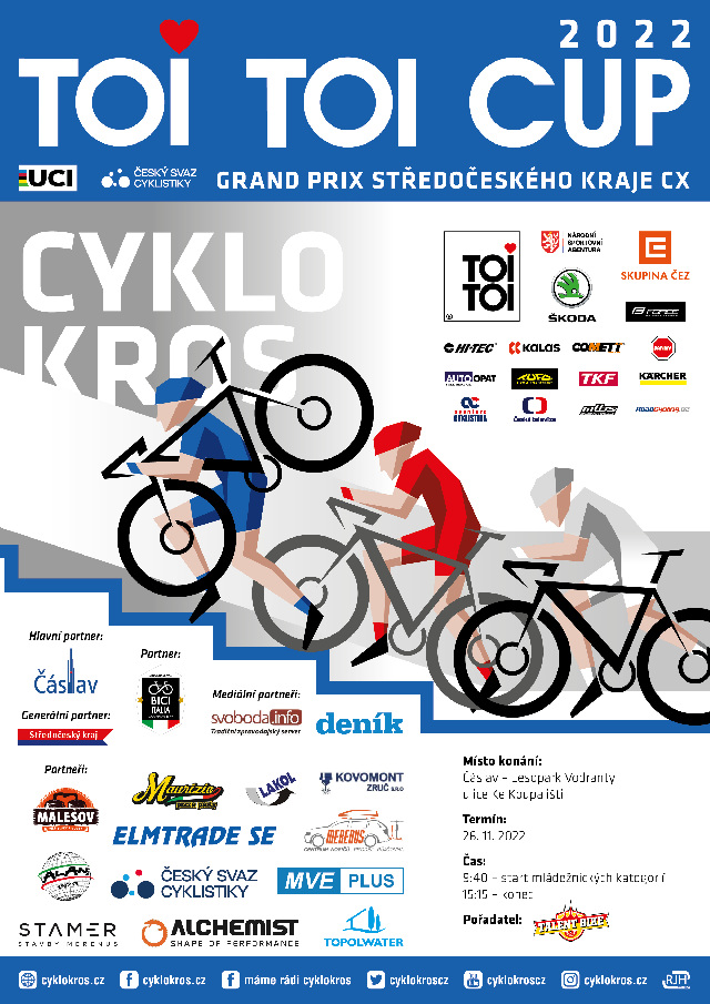 5.ročník cyklokrosového závodu seriálu Toi Toi Cup, který pořádáme v lesoparku Čáslav - Vodranty, se jede 26.11.2022, druhým rokem zároveň jako závod " Grand Prix Středočeského kraje CX ". První kategorie starších a mladších žákyň ( start 9:40 hod. ) se pojede s účastí domácího pořadatelského Talent Bike Cycling teamu: Adélkou Malinskou. Další z domácích závodníků se na startu objeví: Matyáš Trojan v kategorii mladších žáků ( start 10:20 hod. ) a Jan Roman Zopka v kategorii kadeti ( start 11:45 ).