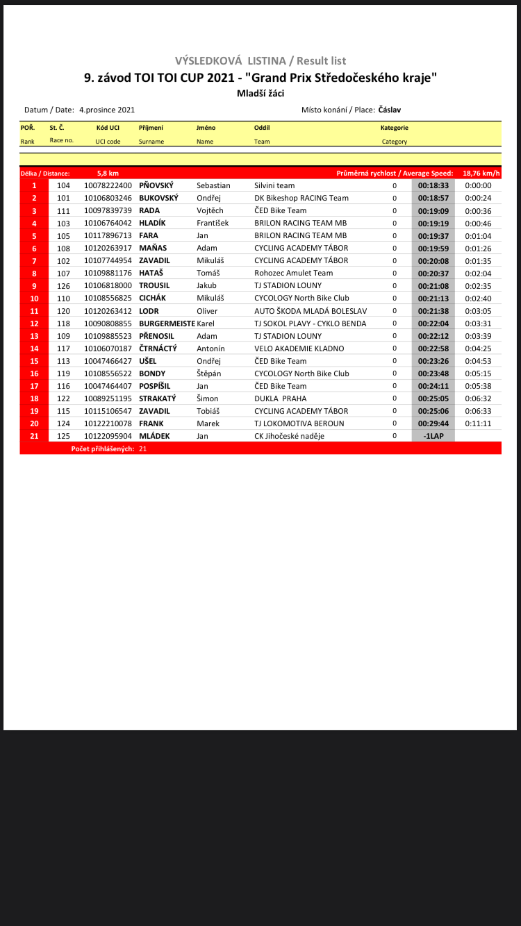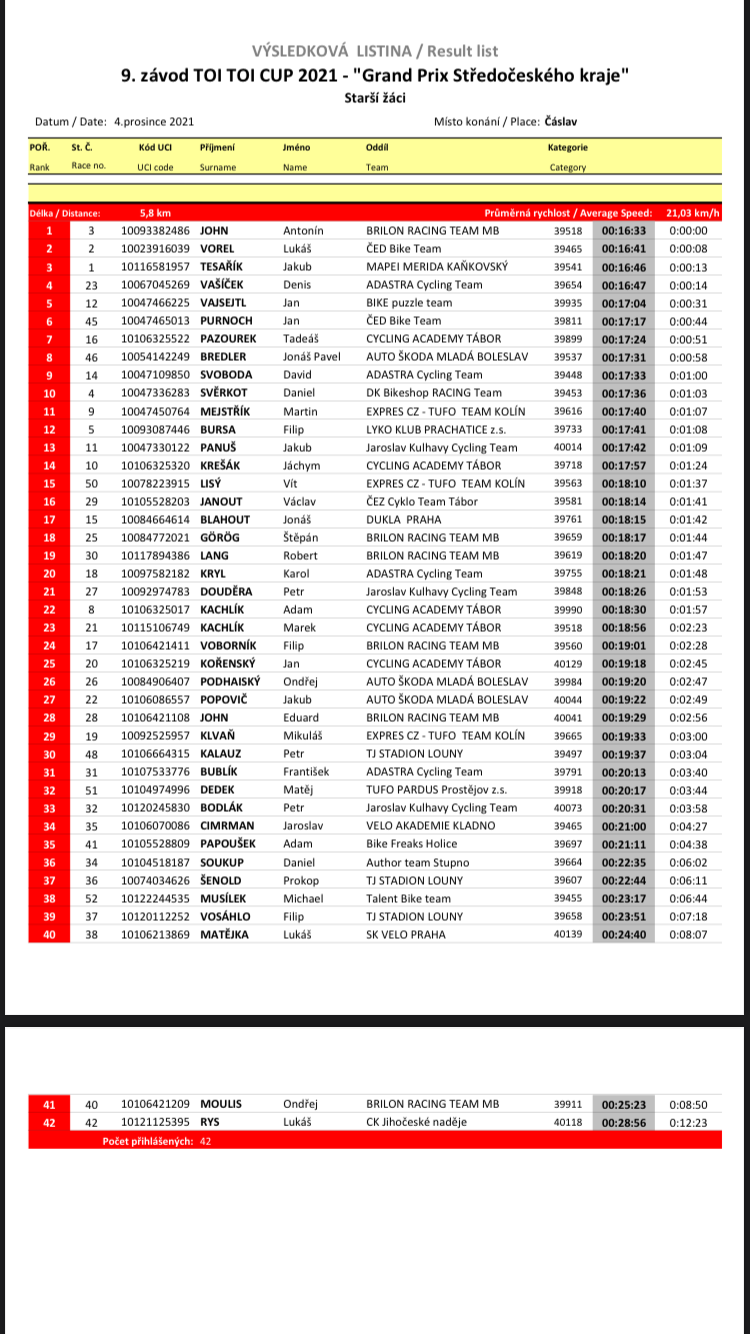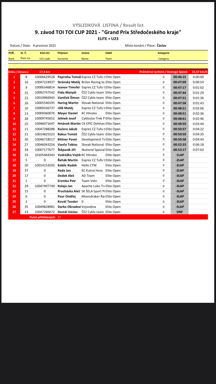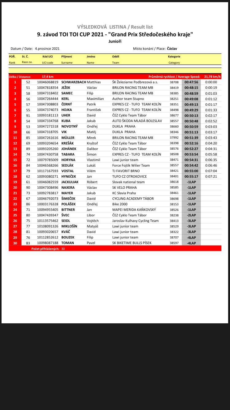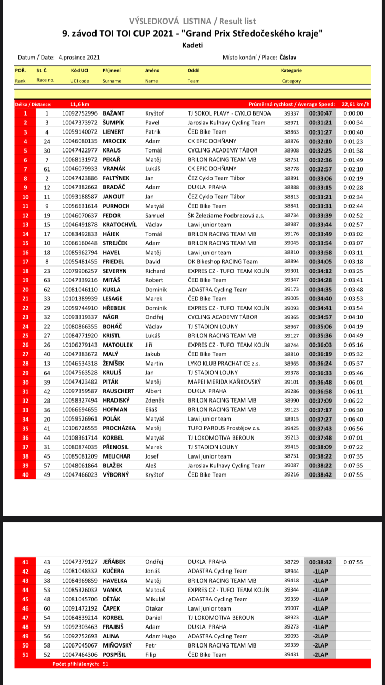 Oficiální výsledky “ Grand Prix Středočeského kraje “ v cyklokrosu - Čáslav 4.12.2021