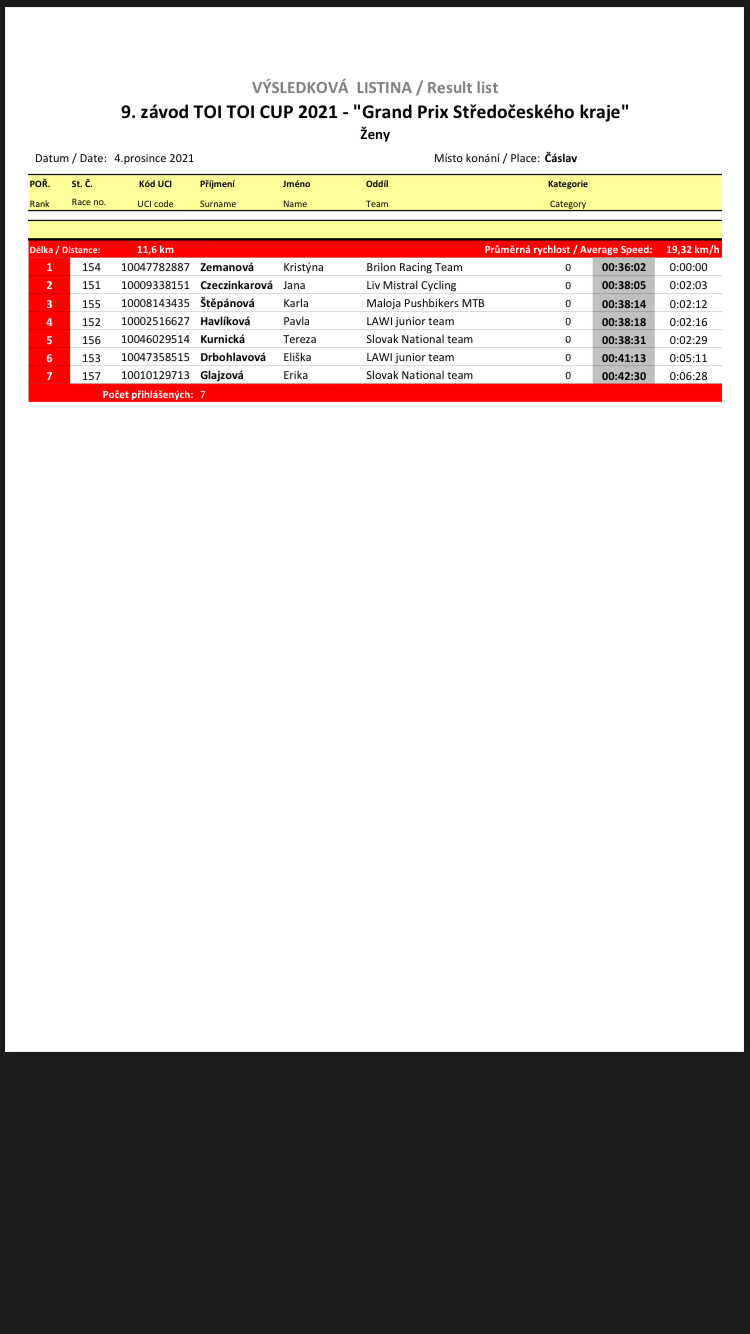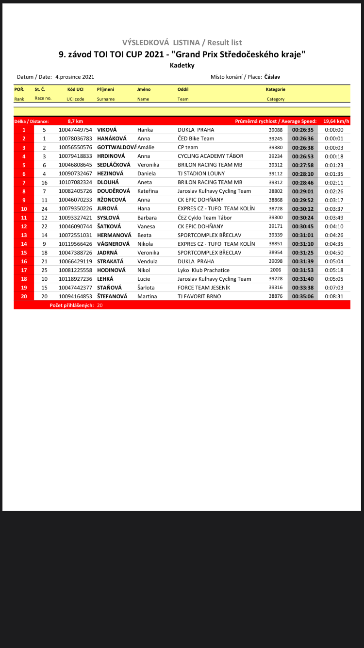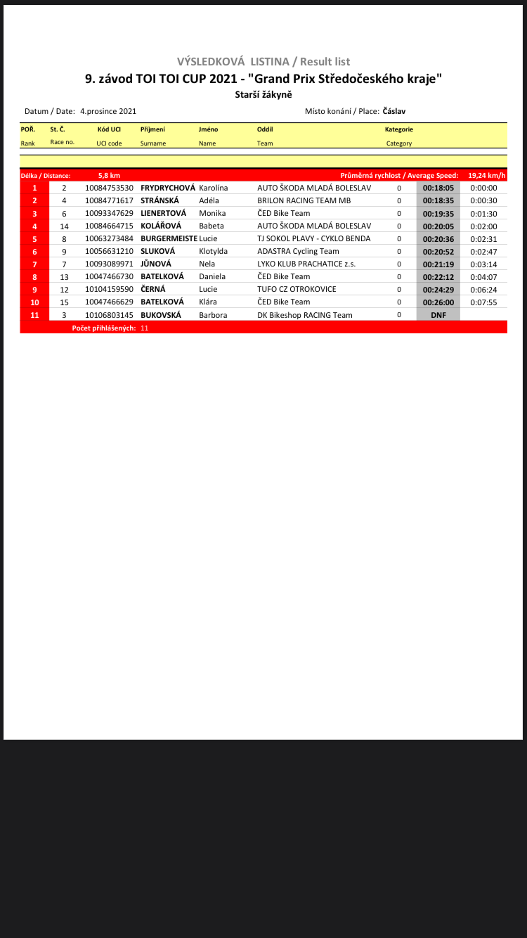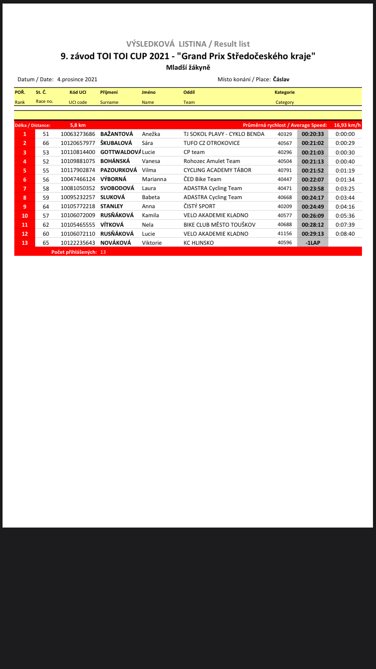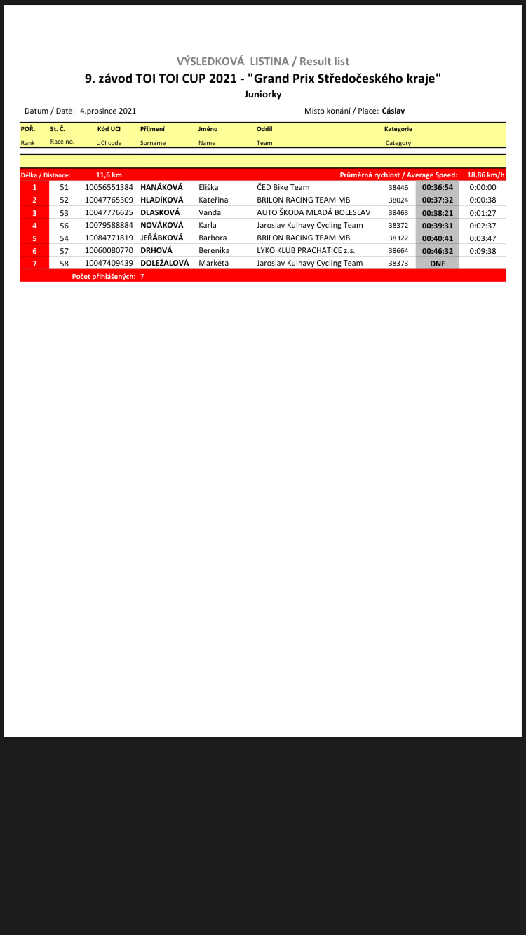 Oficiální výsledky “ Grand Prix Středočeského kraje “ v cyklokrosu - Čáslav 4.12.2021